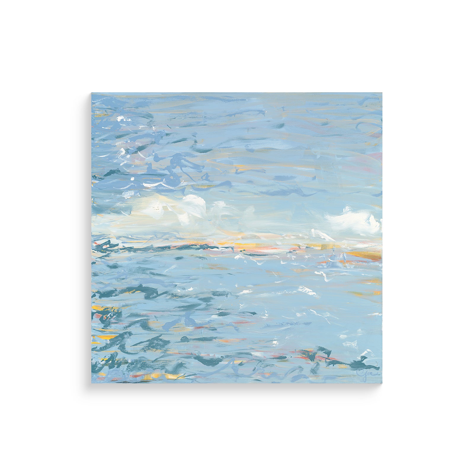 Carolyn Joe's To The Coast is a serene and atmospheric landscape that evokes the tranquil beauty of a coastal escape. Soft, muted tones of blue and beige blend seamlessly to create the sense of a gentle sea breeze and the ebbing rhythm of the ocean. The horizon, subtly defined, draws the eye toward an expansive, peaceful vista, while fluid, textured strokes suggest the movement of water and sky.