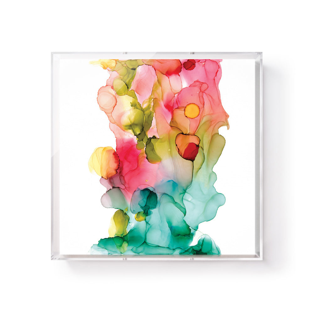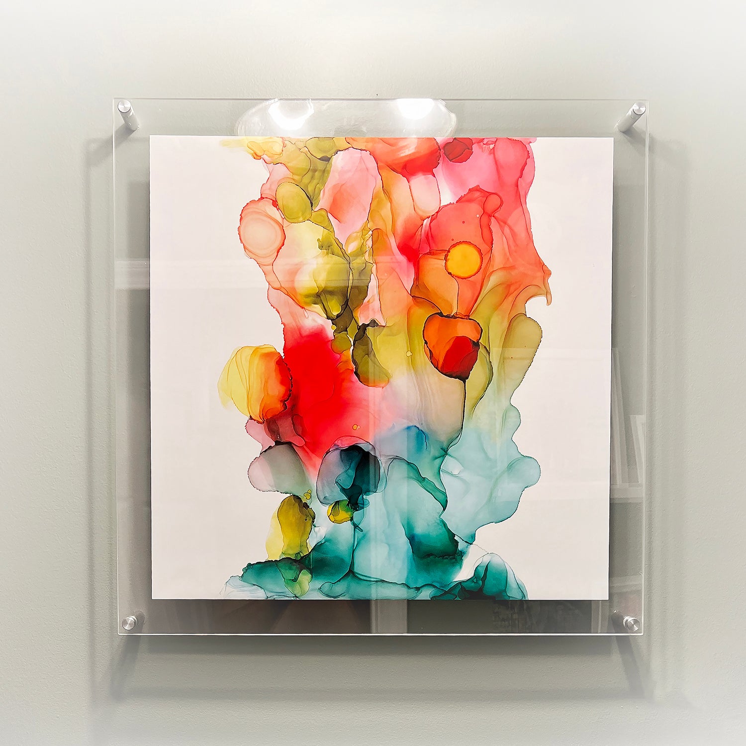20x20" art piece printed on archival, ultra smooth, matte, fine art paper framed in two 23x23" acrylic panels (1/4 and 1/8 inch thickness) with polished edges.