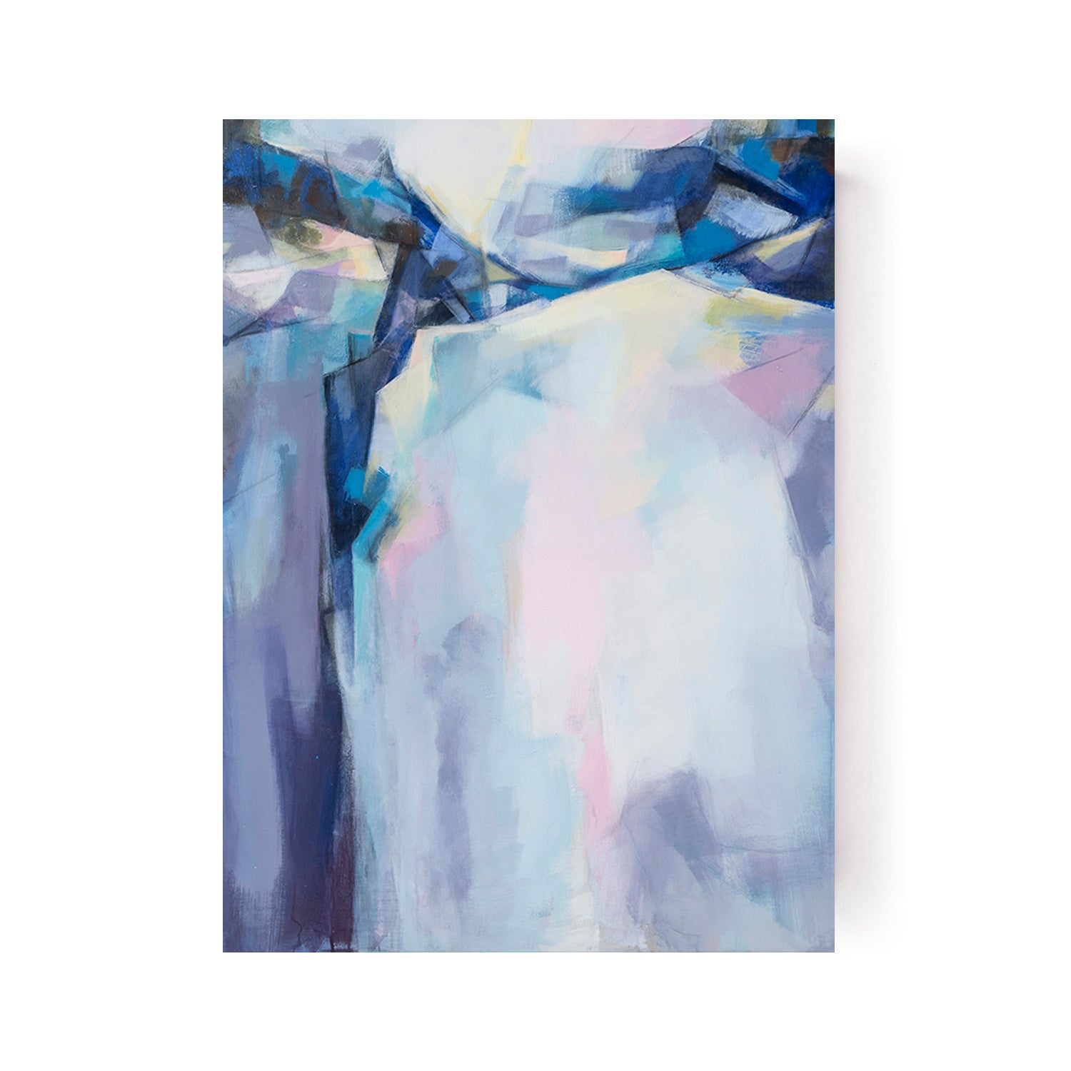 Ann Flemings' A Quiet Secret has a lot of blues, pinks, and teals that softly work together to create a peaceful experience. The composition is reminiscent of a landscape with a blushing pink sky. The most distinctive feature of this piece is how the image is fractured into facets of color, giving it a stained-glass look and feel.