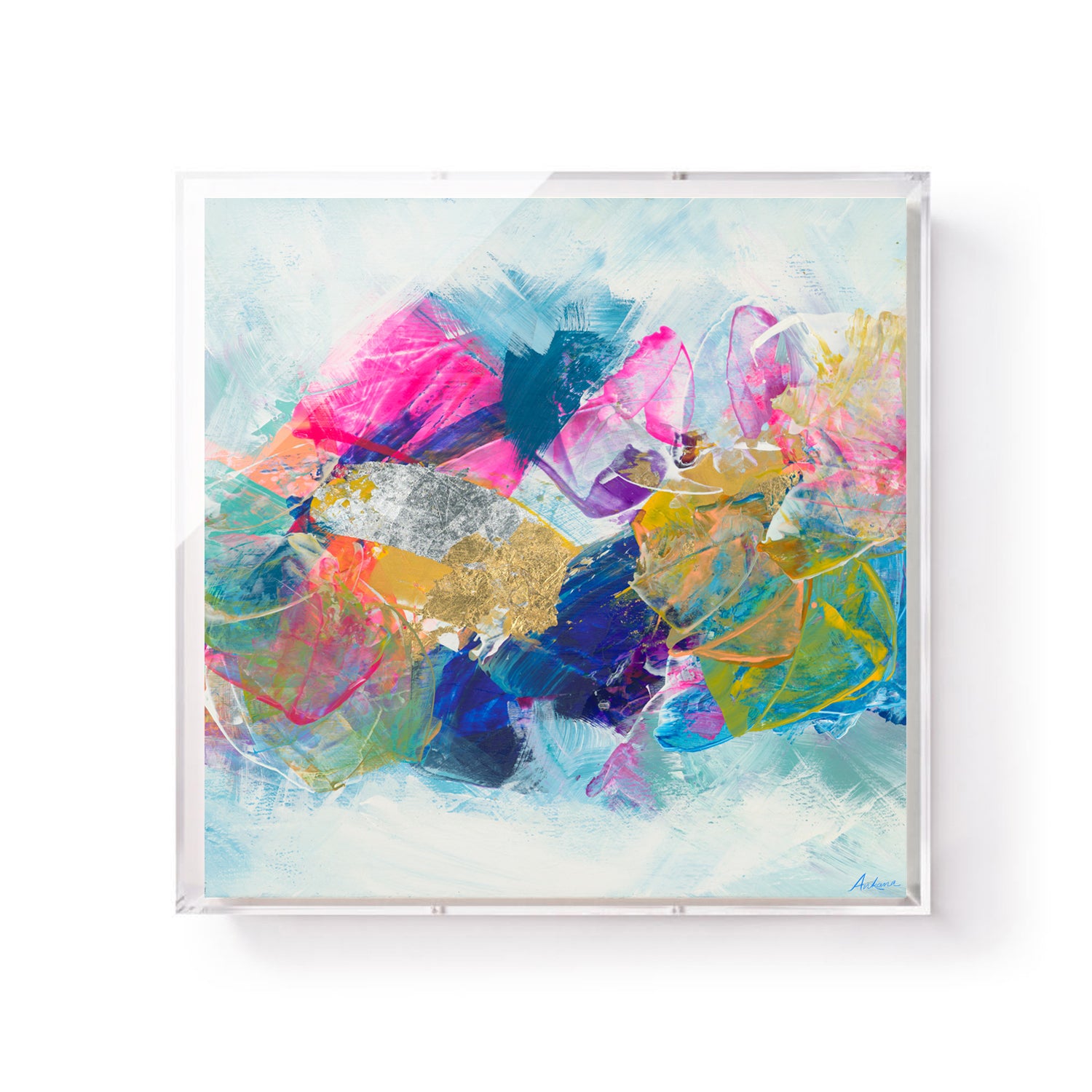 24x36" art piece printed on archival, ultra smooth, matte, fine art paper framed in two 28x40" acrylic panels (1/4 and 1/8 inch thickness) with polished edges.