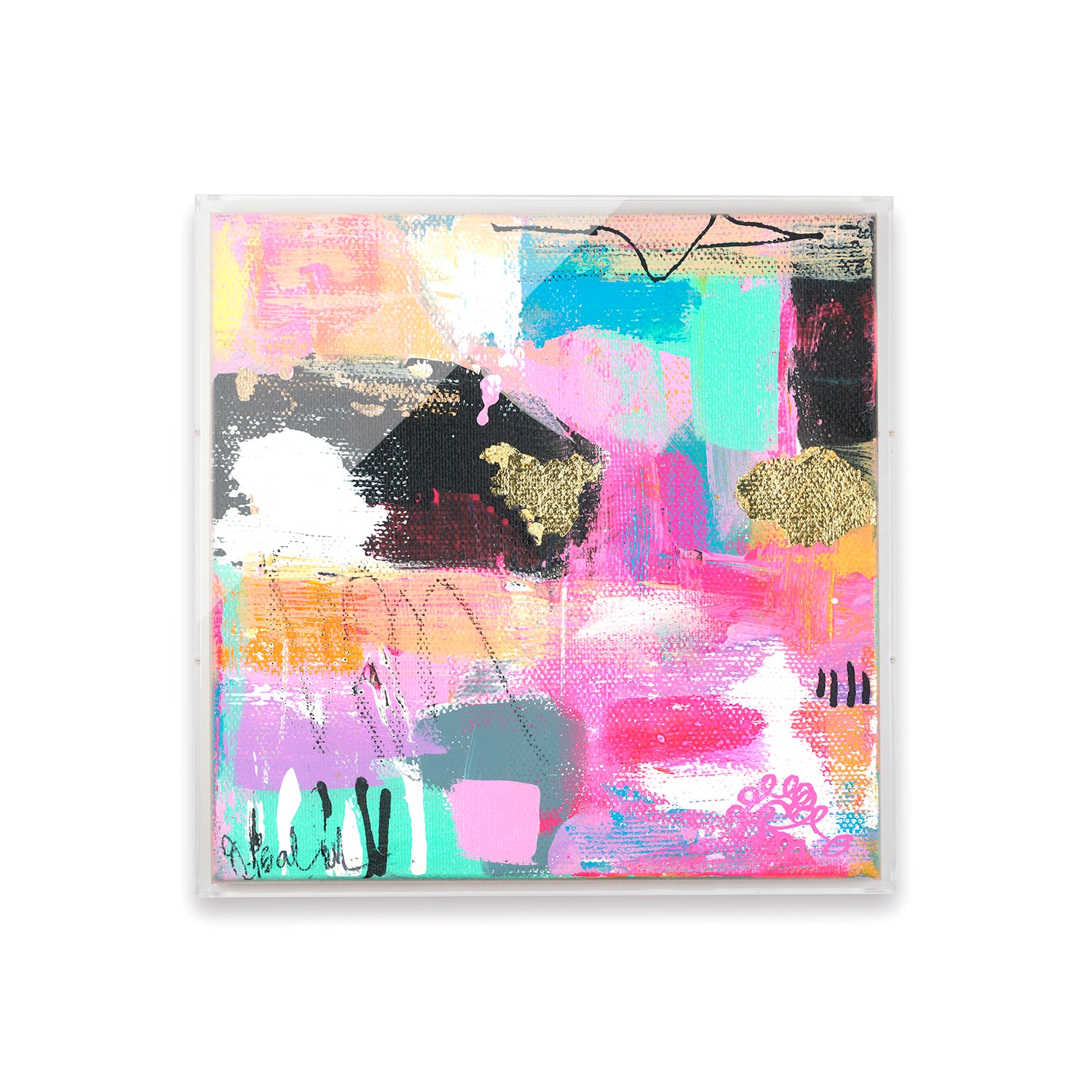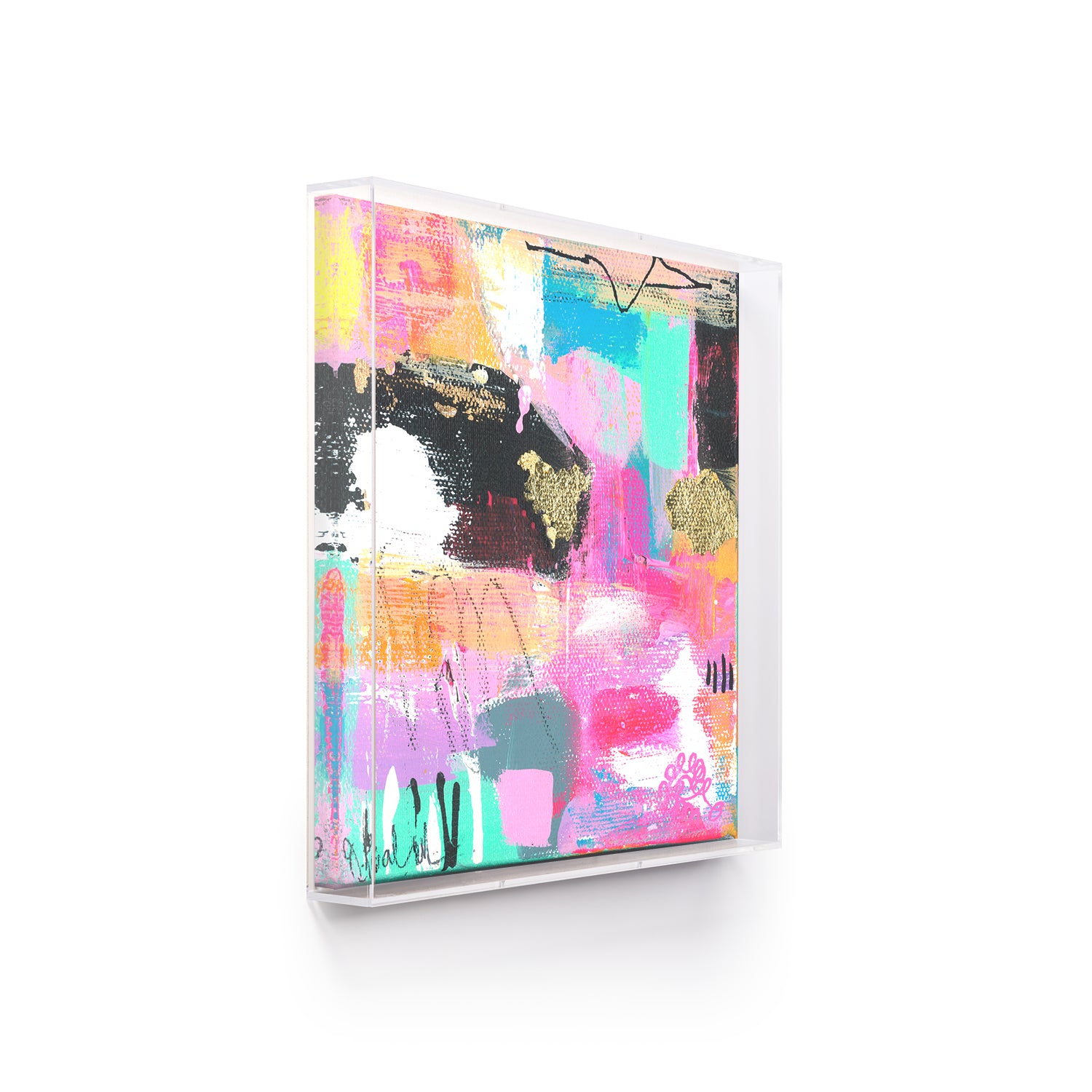 28x28" art piece printed on archival, ultra smooth, matte, fine art paper framed in two 32x32" acrylic panels (1/4 and 1/8 inch thickness) with polished edges.