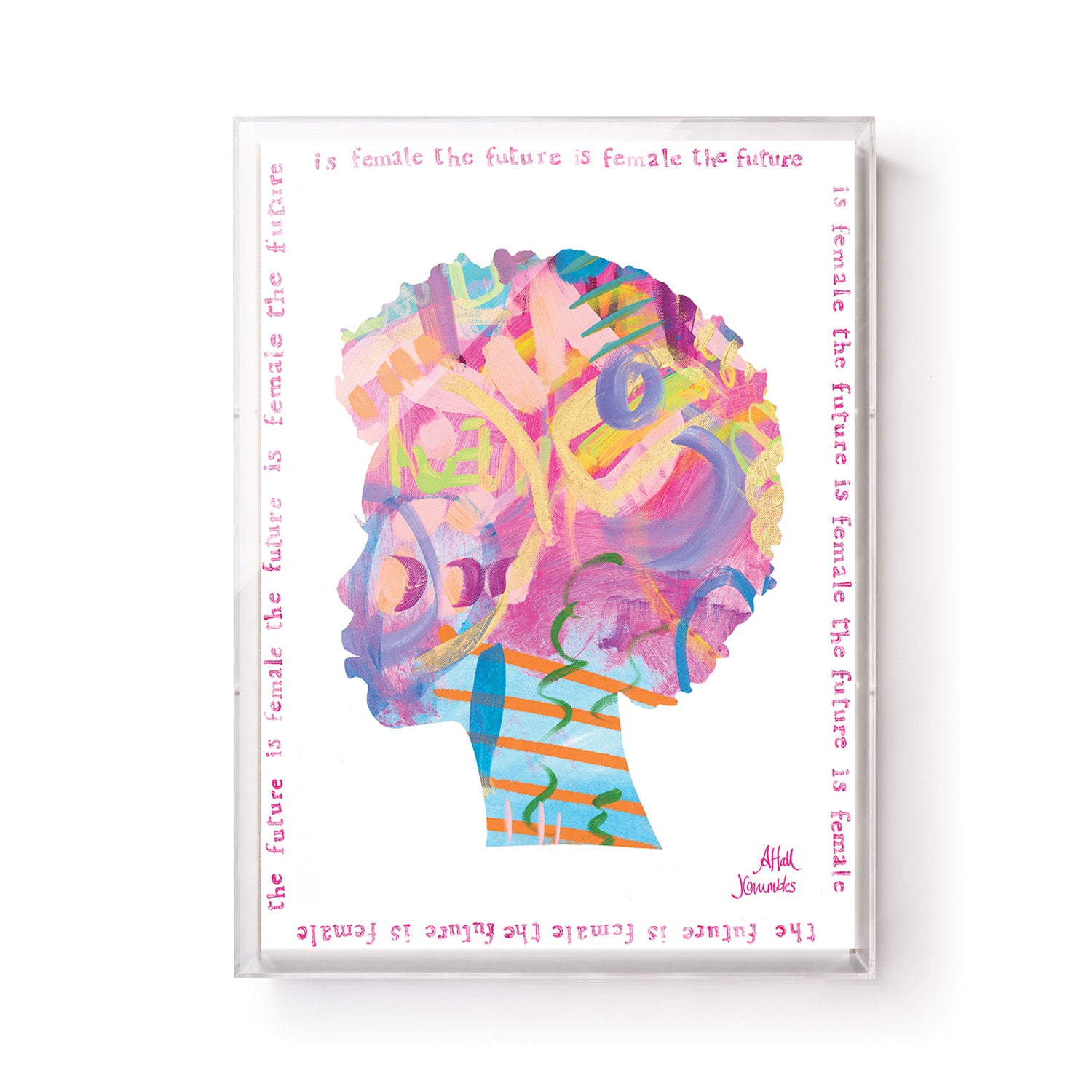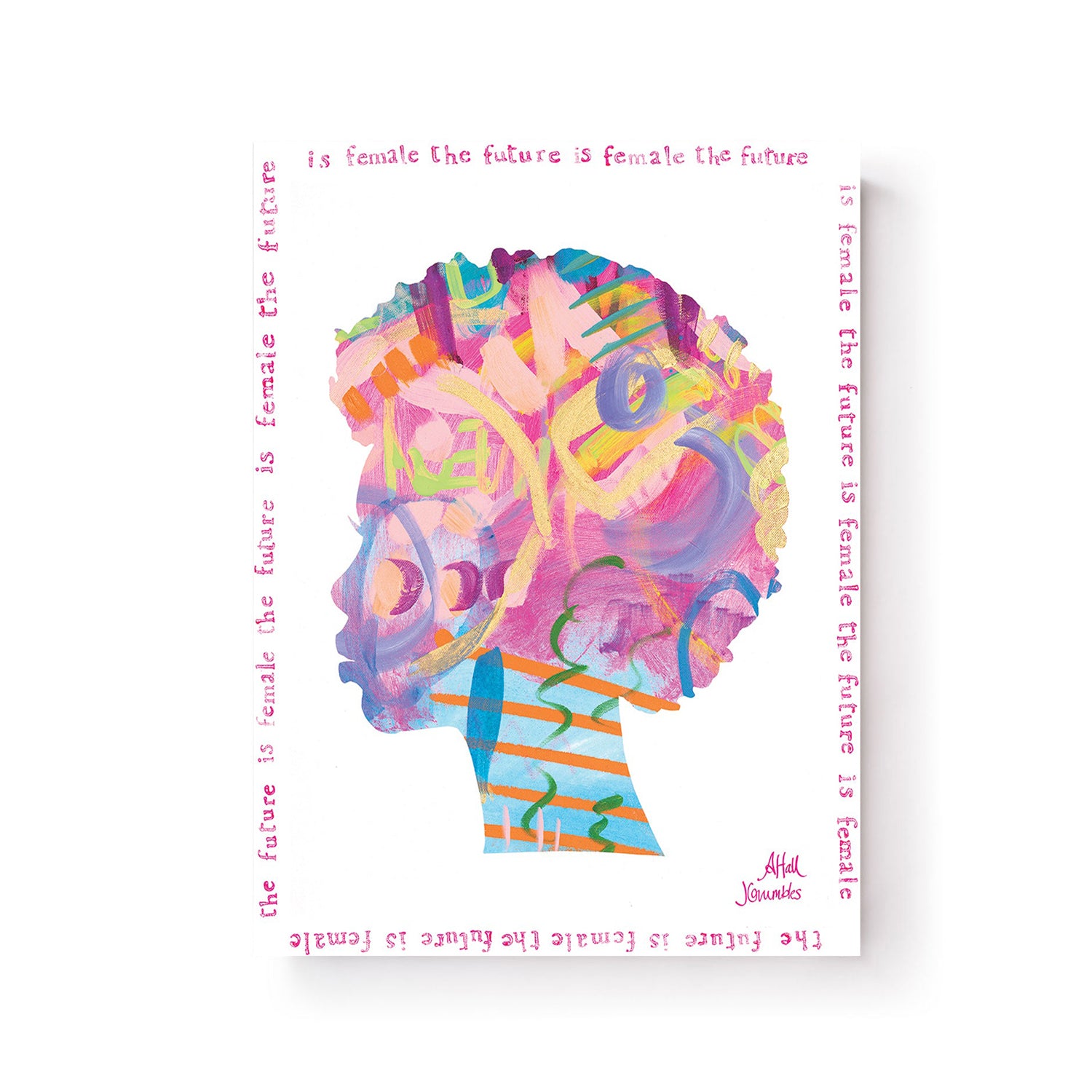 Jenny Grumbles and Allyson Hall's The Future Is Female is a modern and playful take on silhouettes and powerful quotes. Allyson Hall, of About Face Studios, cuts intricate silhouettes out of Jenny Grumble's vibrant acrylic and oil-painted canvasses.