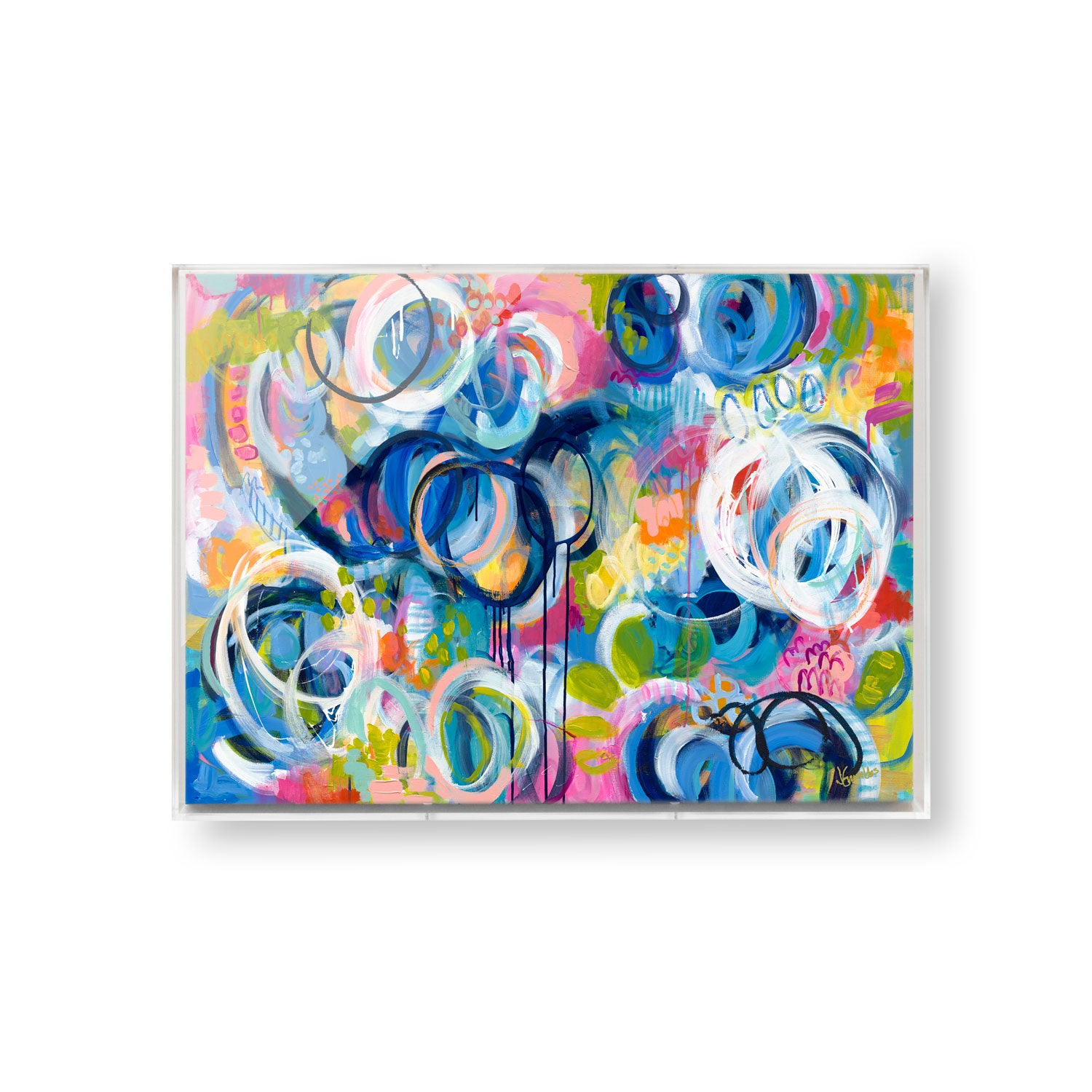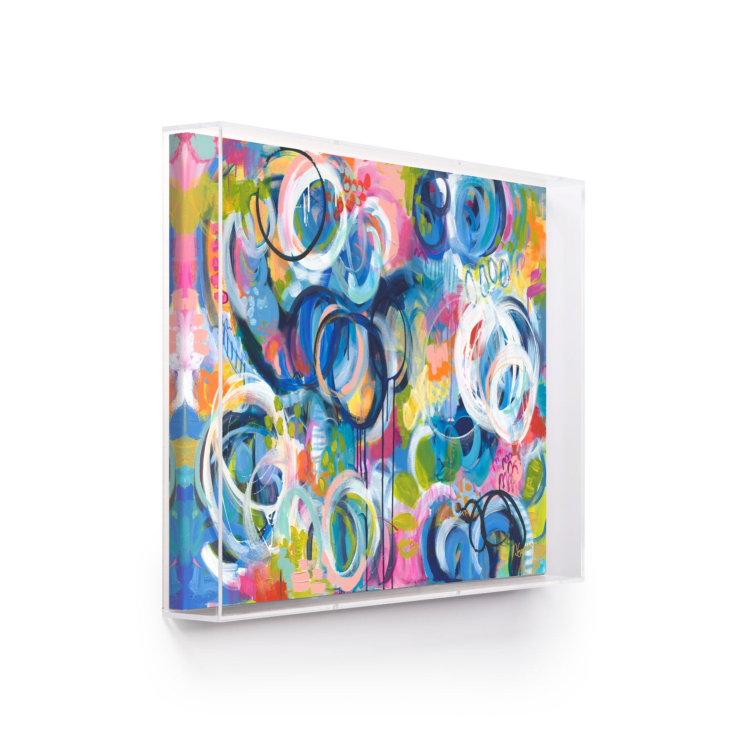 18x24" art piece printed on archival, ultra smooth, matte, fine art paper framed in two 21x27" acrylic panels (1/4 and 1/8 inch thickness) with polished edges.