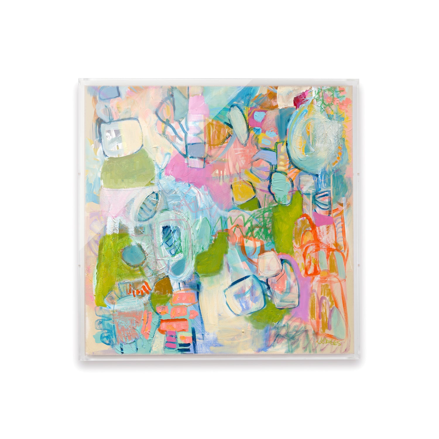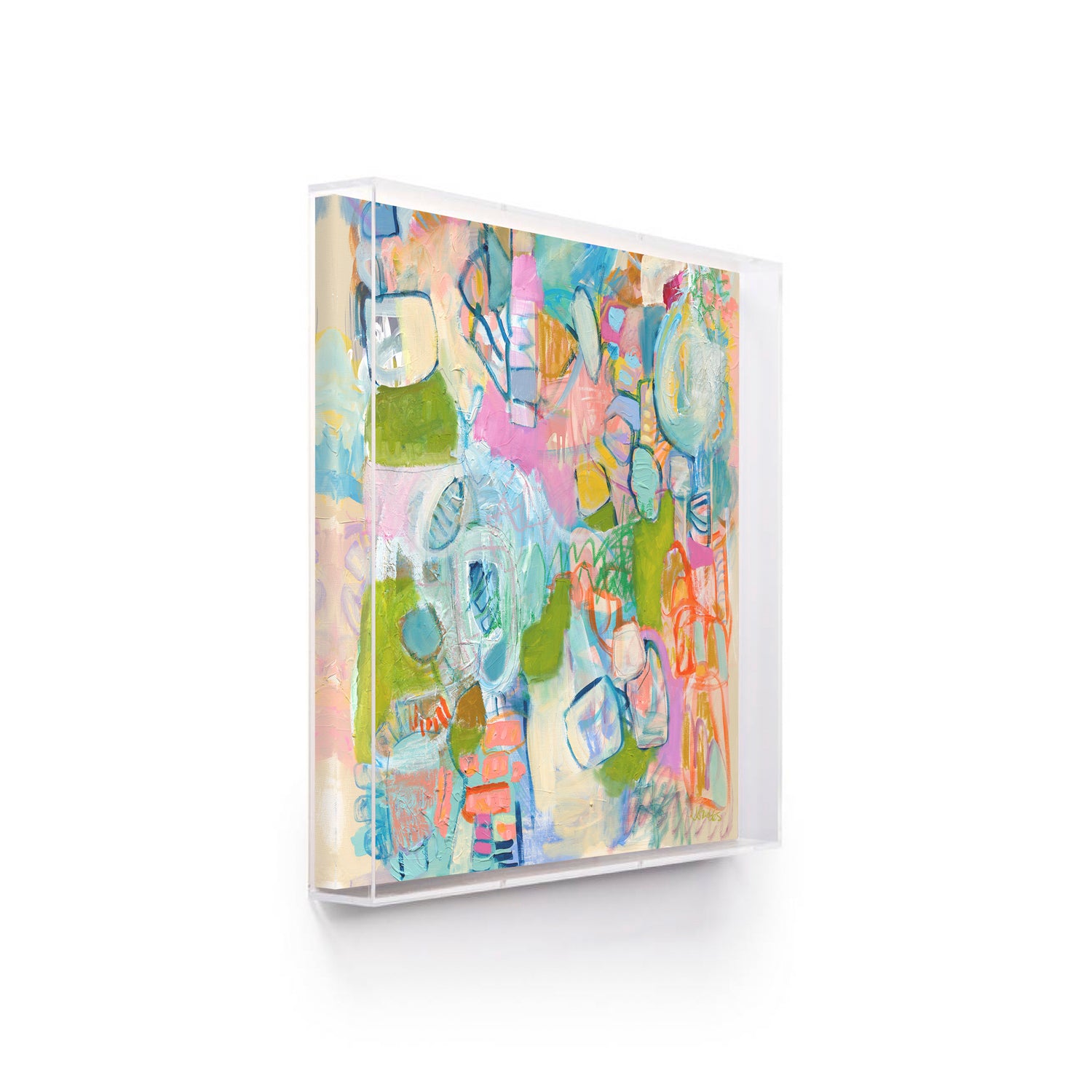 28x28" art piece printed on archival, ultra smooth, matte, fine art paper framed in two 32x32" acrylic panels (1/4 and 1/8 inch thickness) with polished edges.