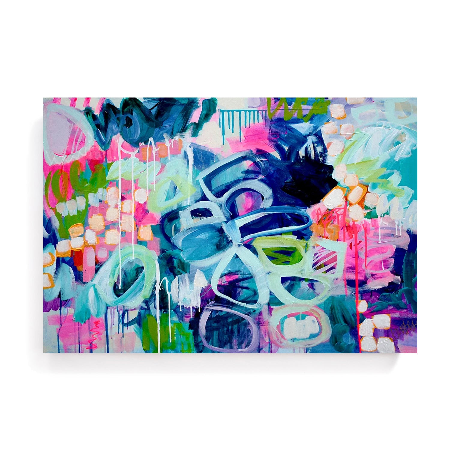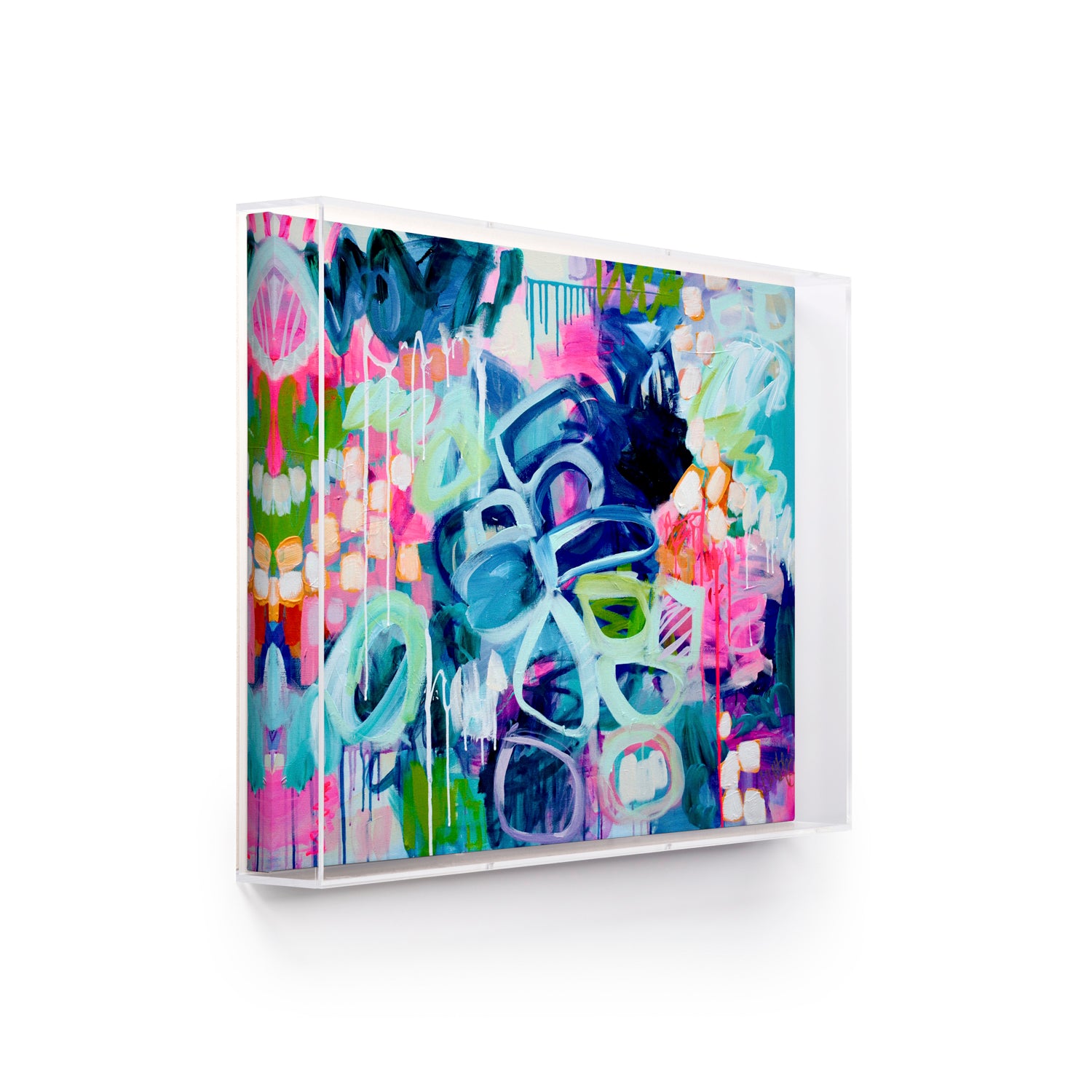 Jenny Grumbles' Love explores the different possibilities of color when overlapping solid and translucent acrylic colors. The bold brush strokes and acrylic drips create abstract shapes that could look like flowers to the human eye.