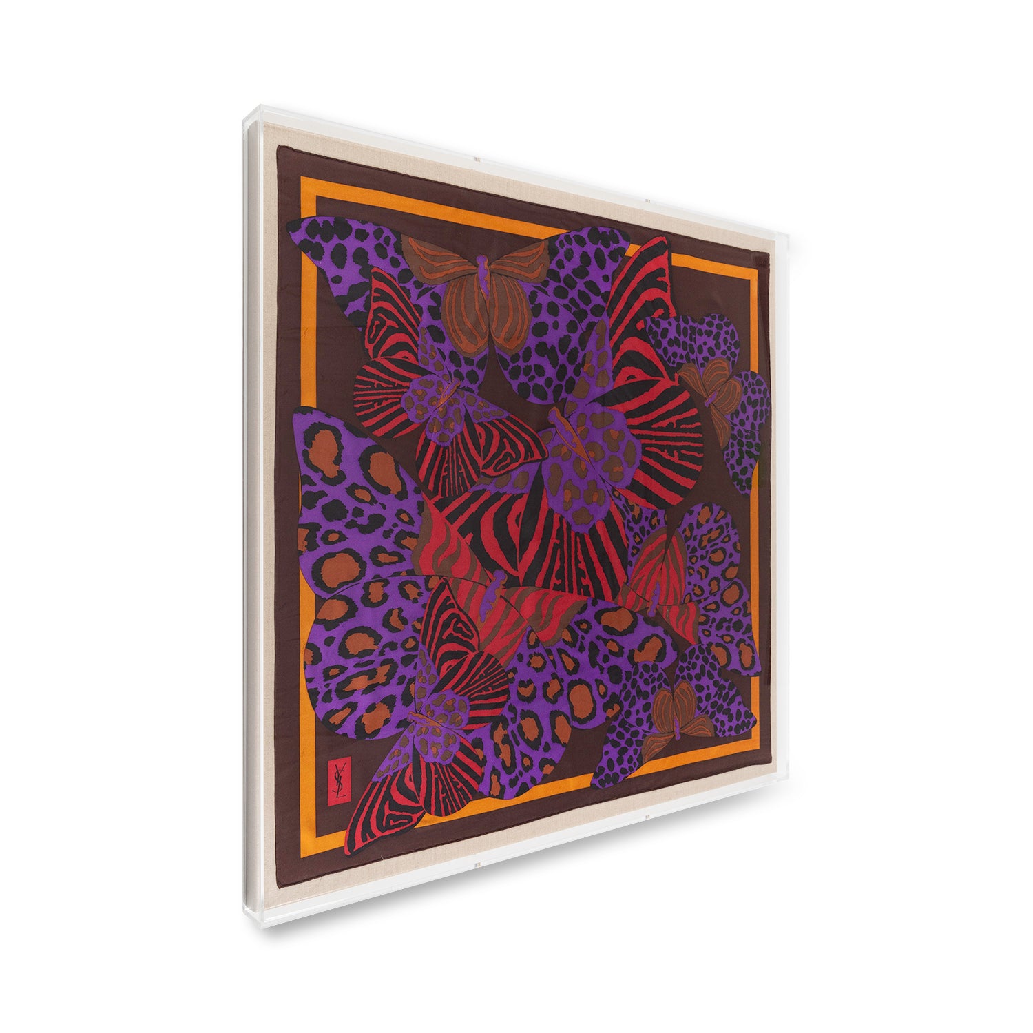 Framed Yves Saint Laurent Butterflies on Brown Silk Scarf in a 36x36x2" Shadowbox