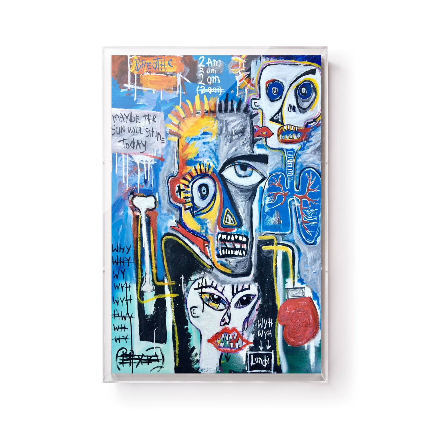 24x36" art piece printed on archival, ultra smooth, matte, fine art paper framed in two 28x40" acrylic panels (1/4 and 1/8 inch thickness) with polished edges.