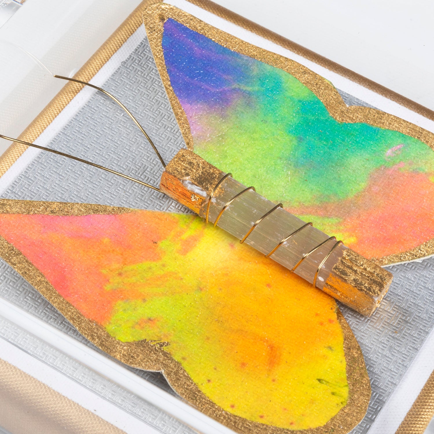 Dana Manly and Wexel Art joined forces to design this exclusive butterfly art featuring gold-dipped selenite, a powerful healing crystal that promotes peace and mental clarity. Inspired by Dana's deep love for butterflies and her incredible eye for color, these delicate beauties symbolize renewal.