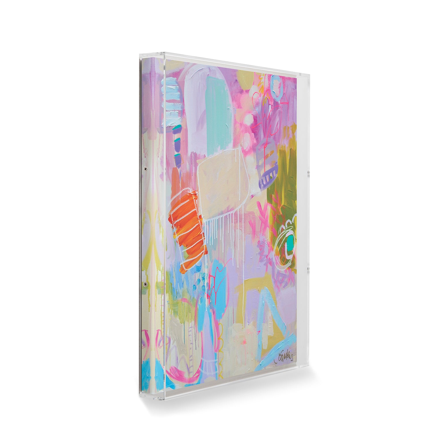 16x20x1" thick art piece printed on archival, ultra smooth, matte canvas framed in a 5-sided 2" acrylic shadowbox lid (3/16" thick) with polished edges and pre-drilled holes.